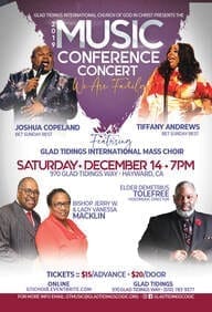 Glad Tidings International COGIC presents it's Music Conference Concert: "We Are Family" Feat: * GTI Mass Choir With special guests from BET's Sunday Best: * Joshua Copeland * Tiffany Andrews Tickets are $15 in advance or $20 at the door ​To purchase tickets, CLICK...